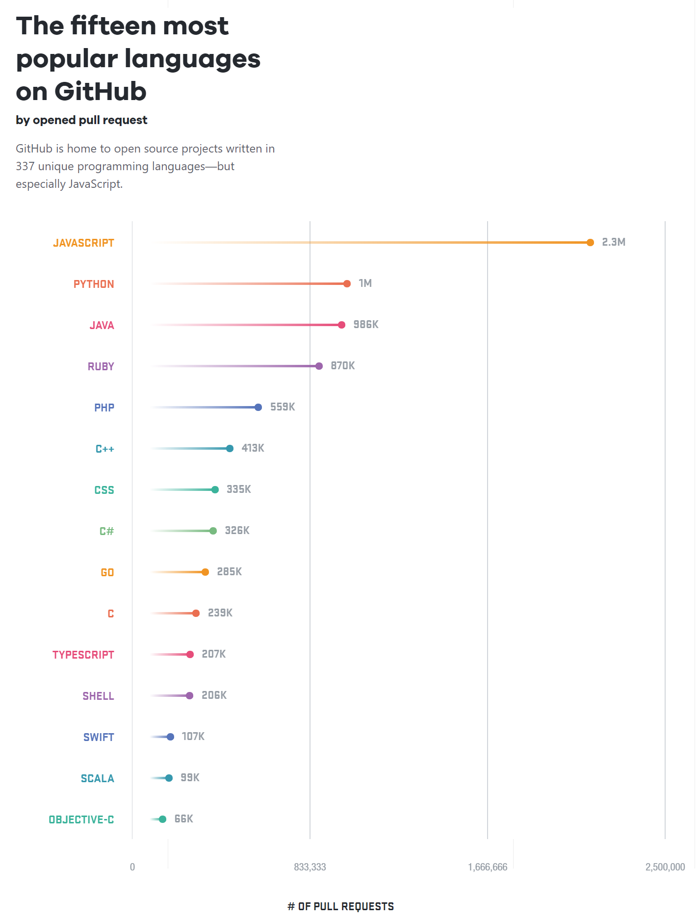 Go語言在全球開發者中得到了廣泛認可,全球使用者約有100萬。在GitHub最新發布的2017年Octoverse報告中,Go語言已成為第九大最受歡迎的語言,超越了C語言。Go語言是2017年GitHub上增長最快的語言,在前十名中,同比增長52%。在增長方面,Go語言與JavaScript互換了位置,後者以44%的增長率降至第二位。