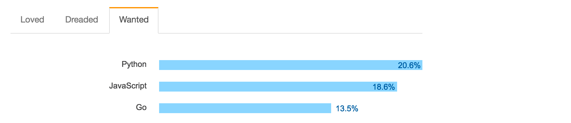 在Stack Overflow的2017年開發者調查中,Go語言是唯一一門同時進入最受歡迎前五名和最渴望前五名的語言。使用Go語言的人喜愛它,而未使用Go語言的人則渴望使用它。