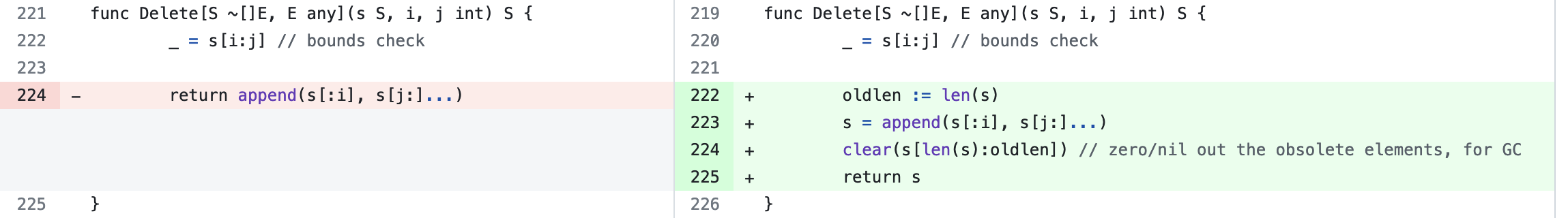 一個關鍵的觀察是,“設定過時的指標為 nil”並不像看起來那麼容易。事實上,這項任務非常容易出錯,以至於我們不應該將編寫它的負擔留給使用者。出於務實的考慮,我們選擇修改 Compact、CompactFunc、Delete、DeleteFunc、Replace 這五個函式的實現,以“清空尾部”。一個很好的副作用是,認知負擔降低了,使用者現在無需擔心這些記憶體洩漏。