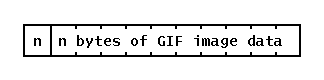 為簡化起見,GIF 檔案包含一個定義畫素深度和影像尺寸的頭部、一個顏色對映(8 點陣圖像為 256 個 RGB 三元組),然後是畫素資料。畫素資料儲存為一維位元流,使用 LZW 演算法進行壓縮,該演算法對於計算機生成的圖形非常有效,但對於攝影影像效果不佳。壓縮後的資料然後被分解為長度分隔的塊,每個塊有一個位元組計數(0-255),後跟該位元組數的位元組。