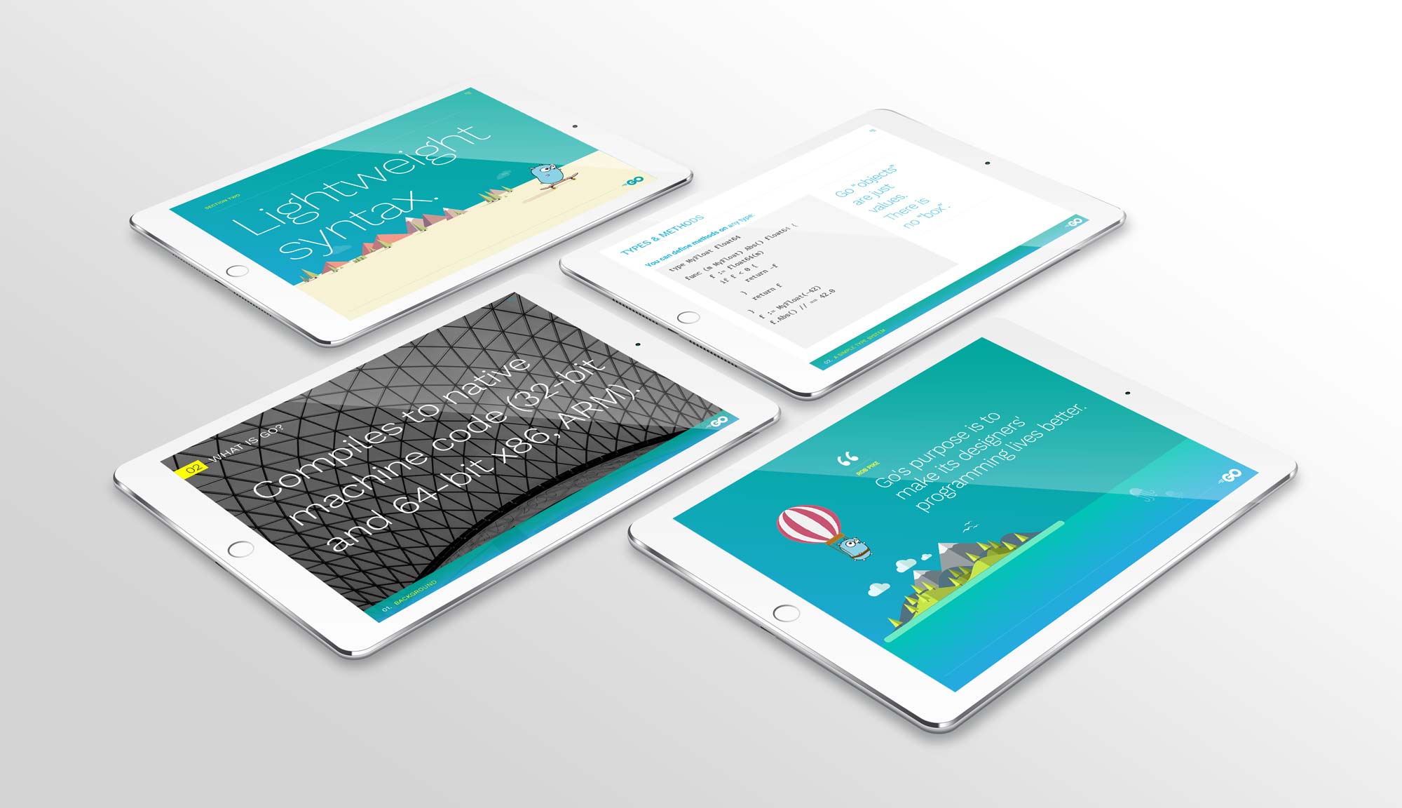 除了品牌指南,我們還開發了一個演示主題。這個演示主題將使我們能夠在聚會和會議上以及在線上,以一致的方式展示 Go。Go 社群成員歡迎使用此主題進行自己的演示。
