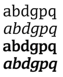 Go Mono 斜體是羅馬體的傾斜版本,例外的是,斜體小寫字母 'a' 被重新設計成草書單層形式,以與 b d g p q 的碗狀結構協調一致。草書 'a' 使斜體比單純傾斜的羅馬體更顯活潑。與許多無襯線字型一樣,人們認為傾斜的羅馬粗襯線字型可能比真正的“草書”斜體更易讀。