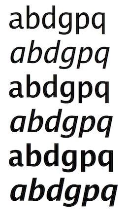 Go 比例斜體與羅馬體具有相同的寬度度量。Go 斜體是羅馬體的傾斜版本,有一個明顯的例外:斜體小寫字母 'a' 被重新設計成草書單層形式,以與 b d g p q 的碗狀結構協調一致,其中直立形式也很適合傾斜。新增草書 'a' 使斜體比單純傾斜的羅馬體更顯活潑。一些排版師認為,傾斜的羅馬無襯線斜體比真正的“草書”無襯線斜體更受歡迎,部分原因是歷史和設計原因。[3]