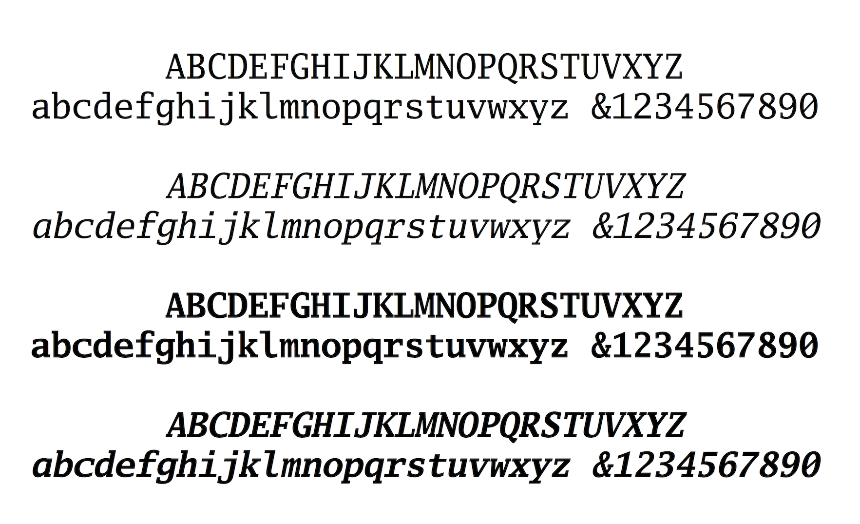 Go Mono 字型是等寬的——每個字母的寬度與其他字母相同。自計算機誕生以來,等寬字型就一直被用於程式設計,並且仍然被廣泛使用,因為它們的打字機式的規律性間距使文字在列和行中對齊,這種風格也出現在公元前 5 世紀的希臘銘文中。(古希臘人沒有打字機或電腦鍵盤,但他們有偉大的數學家和塑造了他們字母的偉大的對稱性和模式感。)
