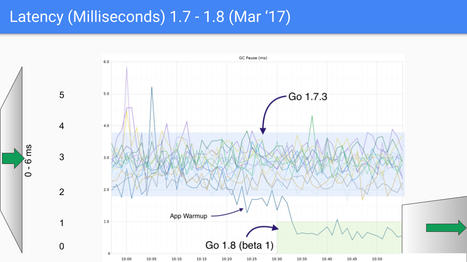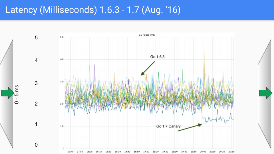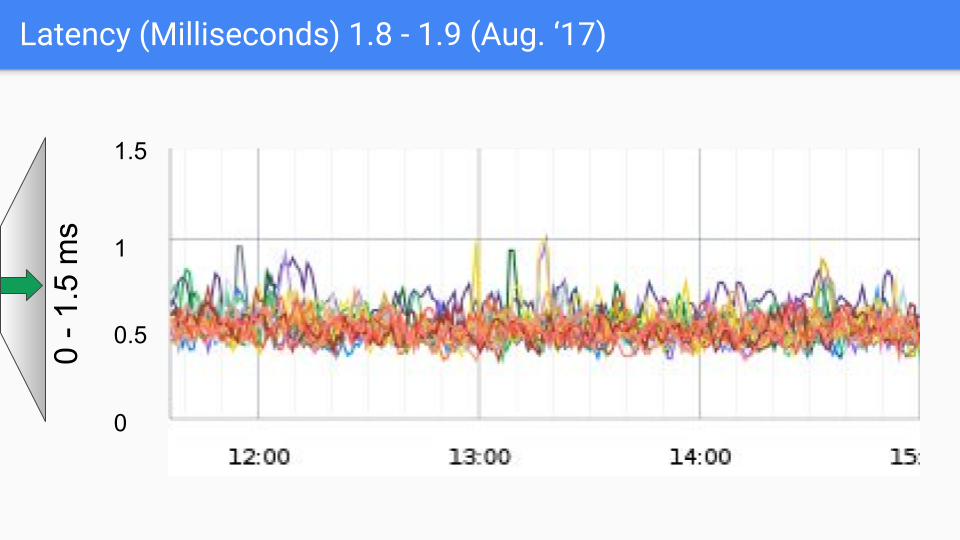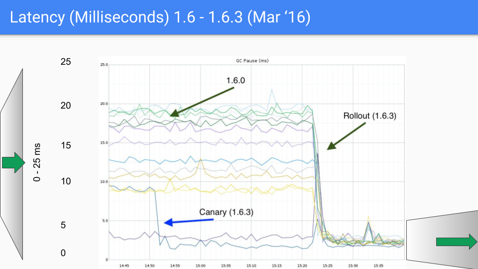 下一個版本是 2017 年 3 月。我們實現了最後一個大幅度降低延遲的改進,這得益於我們找到了如何在 GC 週期結束時避免“停止世界”棧掃描的方法。這使我們的延遲降低到亞毫秒級別。再次,Y 軸將改為 1.5 毫秒,我們看到了第三次數量級改進。