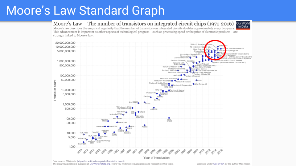 讓我們看看這張圖。這是經典的摩爾定律圖。Y 軸是晶片上的電晶體數量(對數尺度)。X 軸是 1971 年到 2016 年的年份。我注意到,這些年份是有人預測摩爾定律已死的年份。