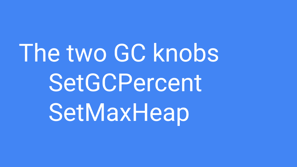Go 提供了兩個控制 GC 的“旋鈕”。第一個是 `GCPercent`。本質上,它是一個用來調整 CPU 使用量和記憶體使用量的旋鈕。預設值為 100,這意味著堆的一半用於存放活動記憶體,一半用於分配。你可以向任一方向調整它。