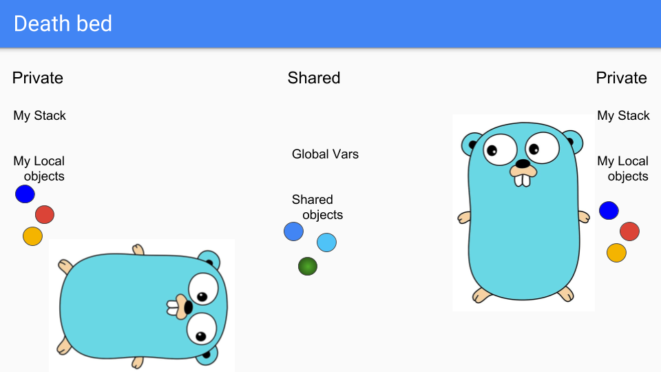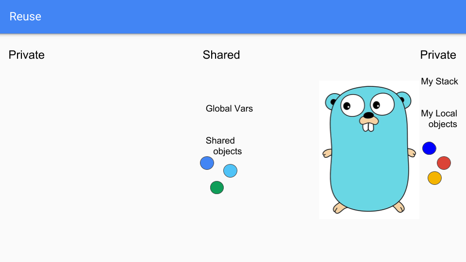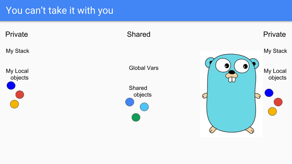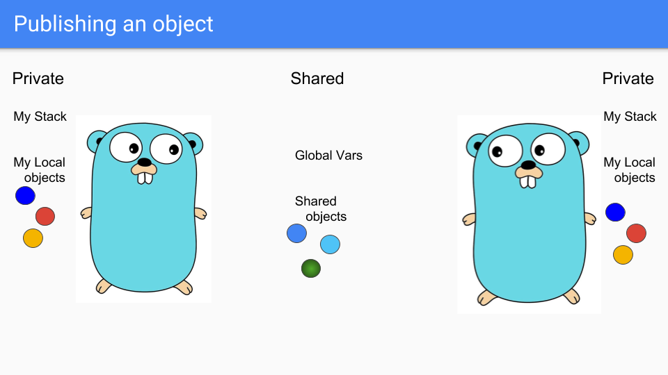 Goroutines 是輕量級執行緒,看起來像 Gophers,所以這裡有兩個 Goroutines。它們共享一些東西,比如中間的兩個藍色物件。它們有自己的私有棧和私有物件的選擇。假設左邊的人想共享綠色物件。