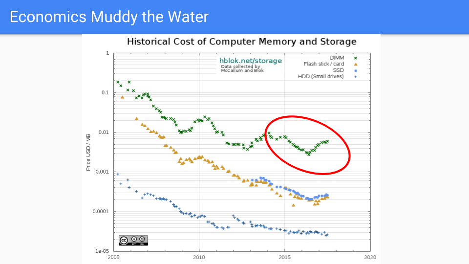 如果您看看紅色圓圈,也就是我們致力於降低 Go GC 延遲的時間,我們會看到在前幾年價格表現不錯。最近,情況不太好,因為需求超過了供應,導致過去兩年價格上漲。當然,電晶體沒有變大,在某些情況下晶片容量仍在增加,所以這是市場力量驅動的。RAMBUS 和其他晶片製造商表示,到 2019-2020 年,我們將看到下一個工藝收縮。