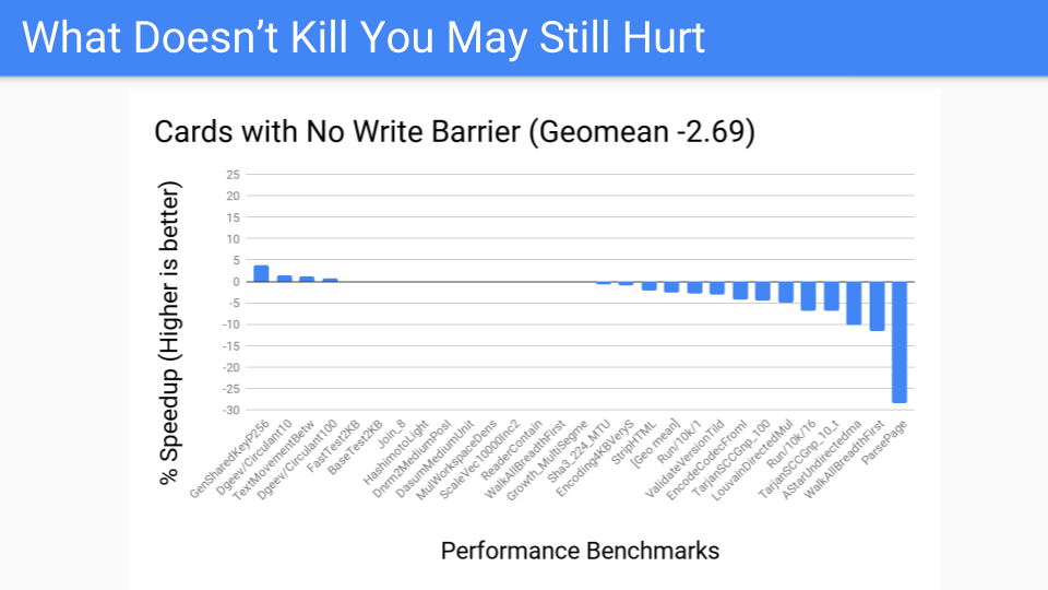 然後我們問,效能基準測試看起來怎麼樣?不太好,有幾個異常值。但現在我們已經將寫屏障從始終在變異器中開啟,轉移到作為 GC 週期的一部分執行。現在,關於是否進行分代 GC 的決定將被推遲到 GC 週期開始。我們有更多的控制權,因為我們已經將卡片工作本地化了。既然我們有了工具,就可以將其交給 Pacer,它可以很好地動態地關閉那些落在右側(不適合分代 GC)的程式。但這會贏嗎?我們必須知道,或者至少思考一下硬體未來的樣子。