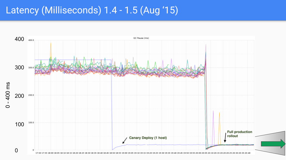 2017 年 8 月的版本改進不大。我們知道導致剩餘暫停的原因。SLO 的“耳語數”(whisper number)約為 100-200 微秒,我們將朝著這個目標努力。如果您看到任何超過幾百微秒的情況,我們真的很想和您談談,看看它是否屬於我們已知的情況,或者是否是我們尚未研究過的新情況。無論如何,似乎對更低延遲的需求不大。需要注意的是,這些延遲級別可能是由各種非 GC 原因引起的,正如俗話所說:“你不必比熊跑得快,你只需要比你旁邊的人跑得快。”