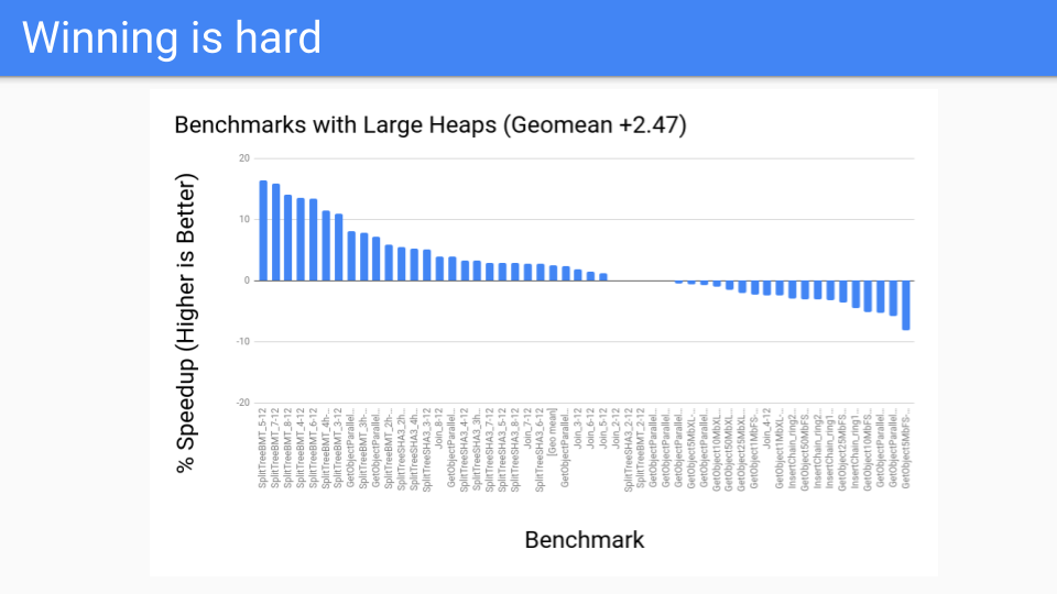 那麼效能如何?對於大堆來說還不錯。這些是 GC 應該表現良好的基準測試。這一切都很好。