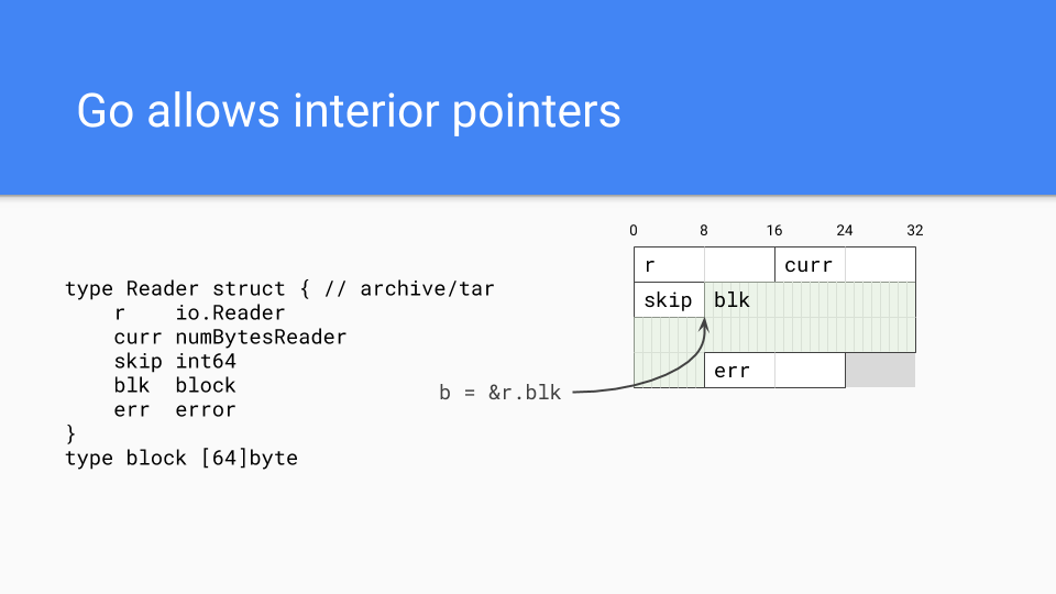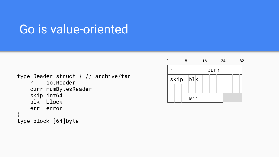接下來重要的是 Go 是一種面向值(value-oriented)的語言,遵循 C 風格系統語言的傳統,而不是大多數託管執行時語言的面向引用(reference-oriented)語言的傳統。例如,這展示了 `tar` 包中的一個型別在記憶體中的佈局。所有欄位都直接嵌入在 `Reader` 值中。這使得程式設計師在需要時可以更好地控制記憶體佈局。可以將相關的欄位放在一起,這有助於提高快取區域性性。