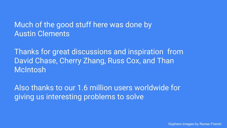 我們還要感謝全球160萬 Go 使用者,他們為我們提供了有趣的問題來解決。沒有他們,很多問題就不會浮出水面。