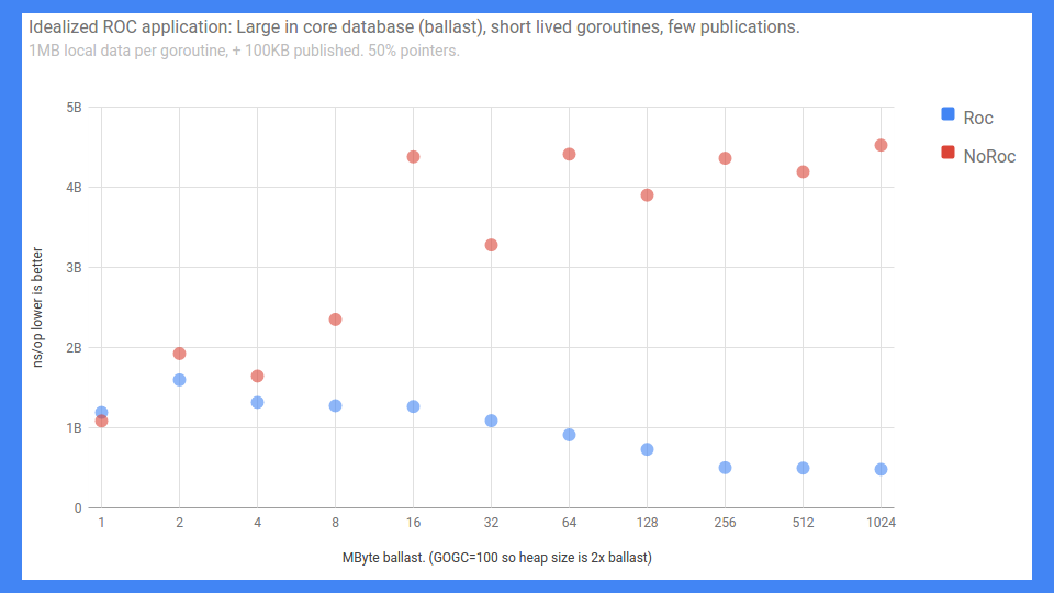 的確,我們進行了擴充套件,但我們只有 4 到 12 個硬體執行緒系統,所以我們無法克服寫屏障的開銷。也許將來當我們擁有 128 核系統並得到 Go 的利用時,ROC 的擴充套件性可能會成為優勢。到那時,我們可能會重新審視,但目前 ROC 是一個失敗的提議。