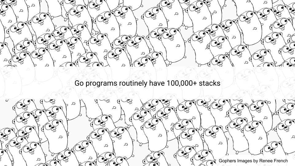首先,Go 程式擁有數十萬個棧。它們由 Go 排程器管理,並且總是在 GC 安全點被搶佔。Go 排程器將 Go 程複用(multiplex)到 OS 執行緒上,通常一個 OS 執行緒對應一個硬體執行緒。我們透過複製棧並更新棧中的指標來管理棧及其大小。這是一個區域性操作,因此擴充套件性相當好。