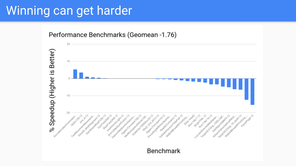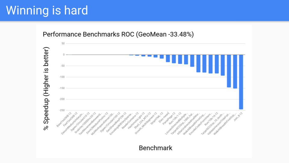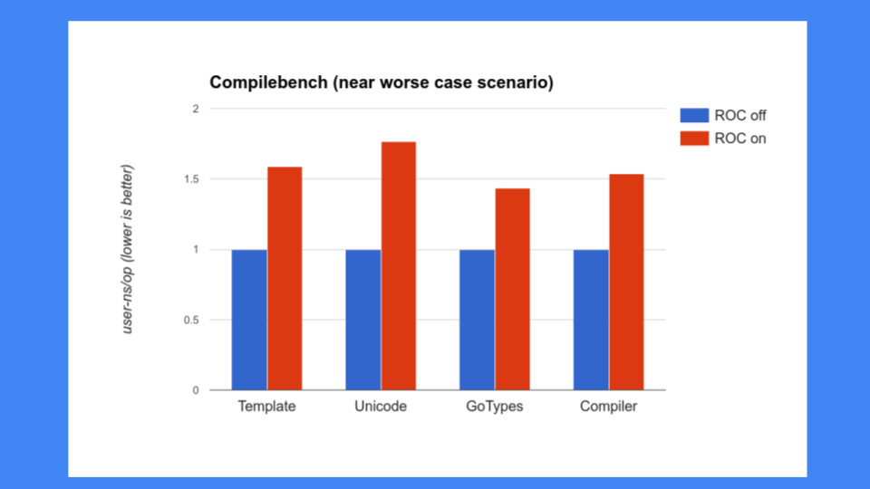但這還不夠好,我們還必須確保 ROC 不會減慢系統的其他部分。當時人們對我們的編譯器非常關注,我們不能減慢編譯器的速度。不幸的是,編譯器恰恰是 ROC 表現不佳的程式。我們看到了 30%、40%、50% 甚至更高的效能下降,這是不可接受的。Go 以其快速的編譯器而自豪,所以我們不能讓編譯器減慢速度,尤其是不能這麼慢。