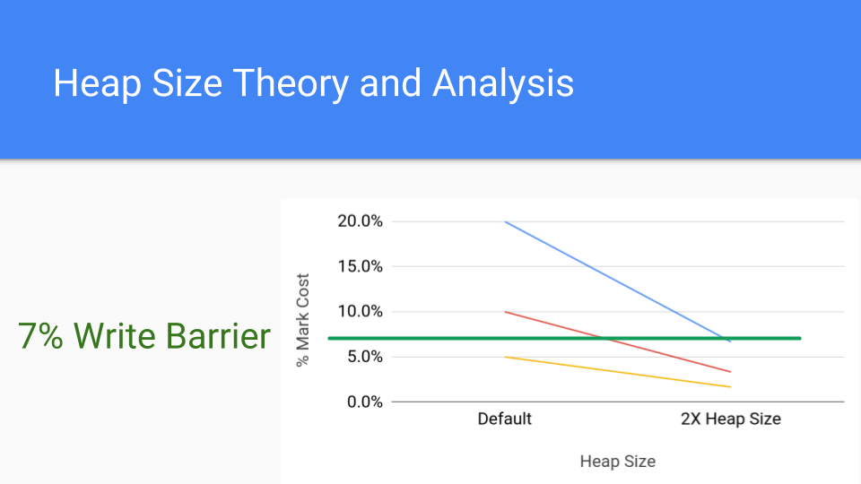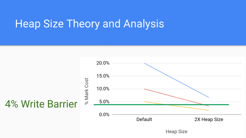這裡是寫屏障更常見的成本,即 4%,我們看到即使有了這個成本,透過簡單地增加堆大小,也可以將標記屏障的成本降低到寫屏障成本之下。