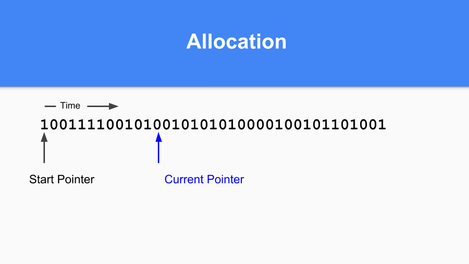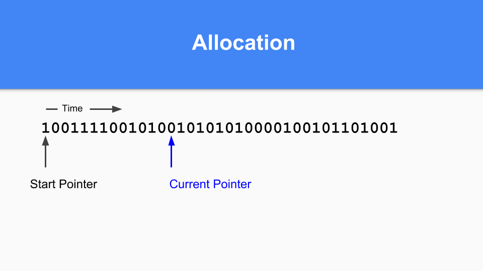 那麼在非移動的情況下它將如何工作?這是標記/分配對映。基本上,您維護一個當前指標。當您進行分配時,您會尋找下一個零,找到零後,您就在該空間中分配一個物件。