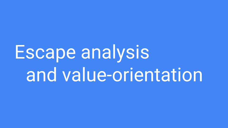 我們還有逃逸分析(escape analysis),它越來越好。還記得我們談到的面向值的東西嗎?我們傳遞實際值而不是函式指標。由於我們傳遞的是值,逃逸分析只需要進行過程內逃逸分析(intraprocedural escape analysis),而不是過程間逃逸分析(interprocedural analysis)。