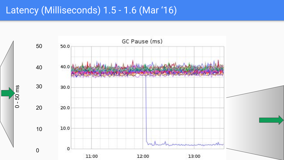 所以,你看,這是 2016 年 8 月,距離第一個版本釋出一年。我們繼續努力消除這些 O(heap size) 的“停止世界”過程。我們討論的是一個 18GB 的堆。我們有更大的堆,當我們消除了這些 O(heap size) 的“停止世界”暫停時,堆的大小顯然可以顯著增長而不影響延遲。所以這對 1.7 版本有所幫助。