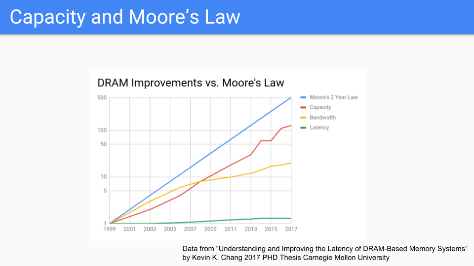 讓我們看看另一張專注於 DRAM 的圖。這些是來自卡內基梅隆大學近期博士論文的資料。如果我們看這張圖,我們會看到摩爾定律是藍線。紅線是容量,它似乎遵循摩爾定律。奇怪的是,我看到一張圖表,可以追溯到 1939 年我們還在使用鼓式儲存器,那時容量和摩爾定律就一直在同步前進,所以這張圖已經持續了很長時間,肯定比在場的大多數人都要長。