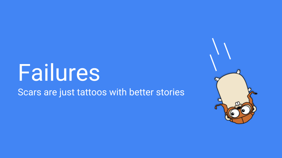 以上是好訊息。現在讓我們轉向並談談我們的失敗。這些是我們的傷疤;它們有點像紋身,每個人都有。總之,它們帶來更好的故事,所以讓我們講講這些故事。