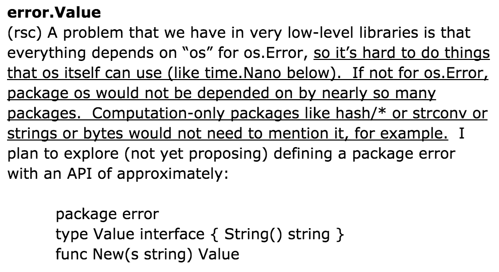 它以一個精確的、單行的陳述開始:在非常底層的庫中,所有東西都匯入“os”來使用 os.Error。然後有五行,我在這裡用下劃線標出,用於描述問題的意義:被“os”使用的包無法在自己的 API 中呈現錯誤,而其他包依賴“os”的原因與作業系統服務無關。