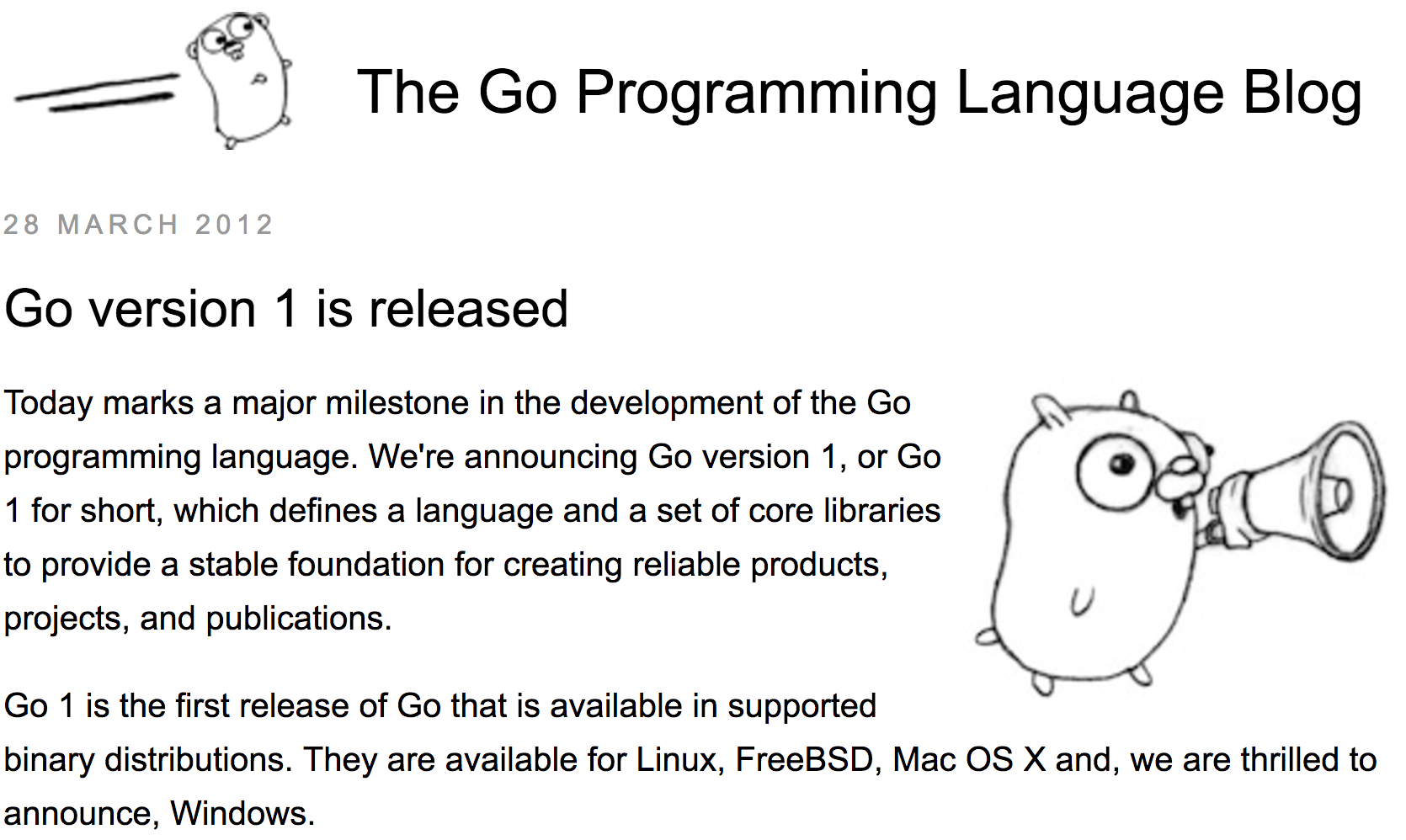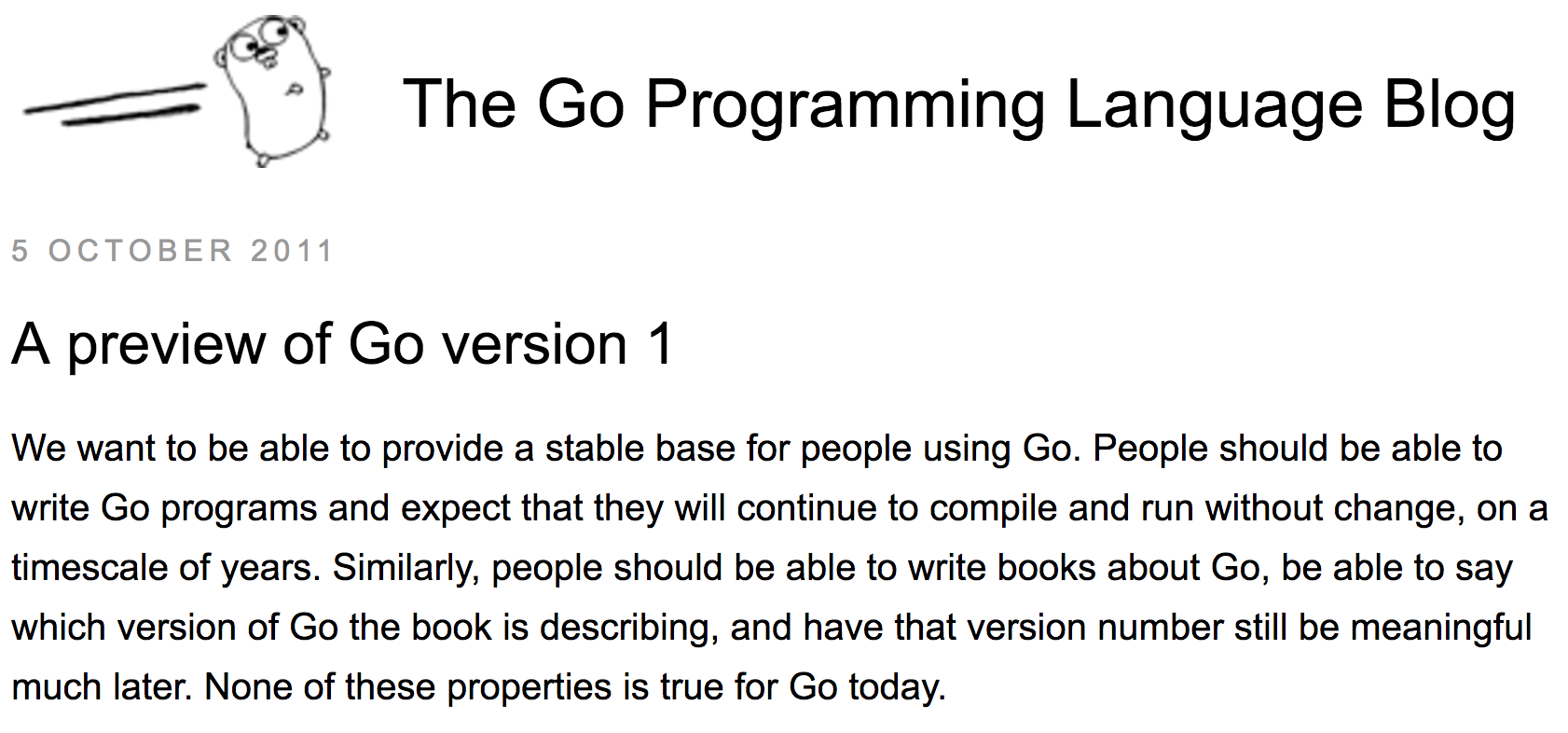 Go 1 的釋出標誌著近五年創意、瘋狂努力的頂峰,我們將一個名稱和一堆想法變成了一個穩定、可用於生產的語言。這也標誌著從變革和動盪轉向穩定的明確轉變。
