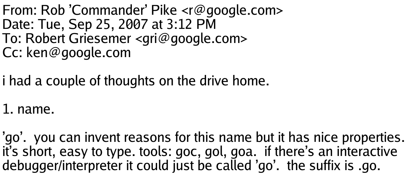 2007 年 9 月 25 日,在 Rob Pike、Robert Griesemer 和 Ken Thompson 討論一種新的程式語言幾天後,Rob 提出了“Go”這個名字。