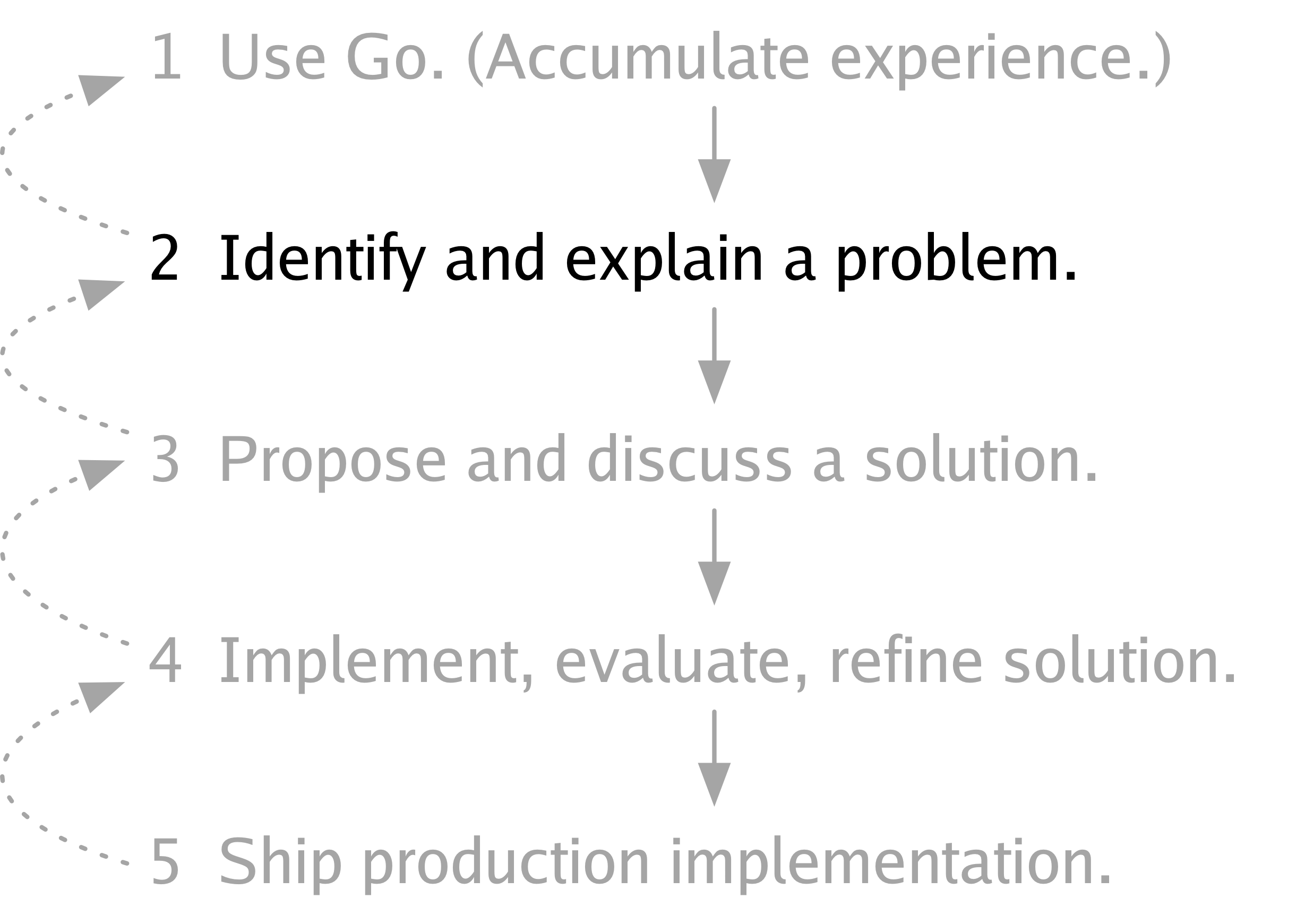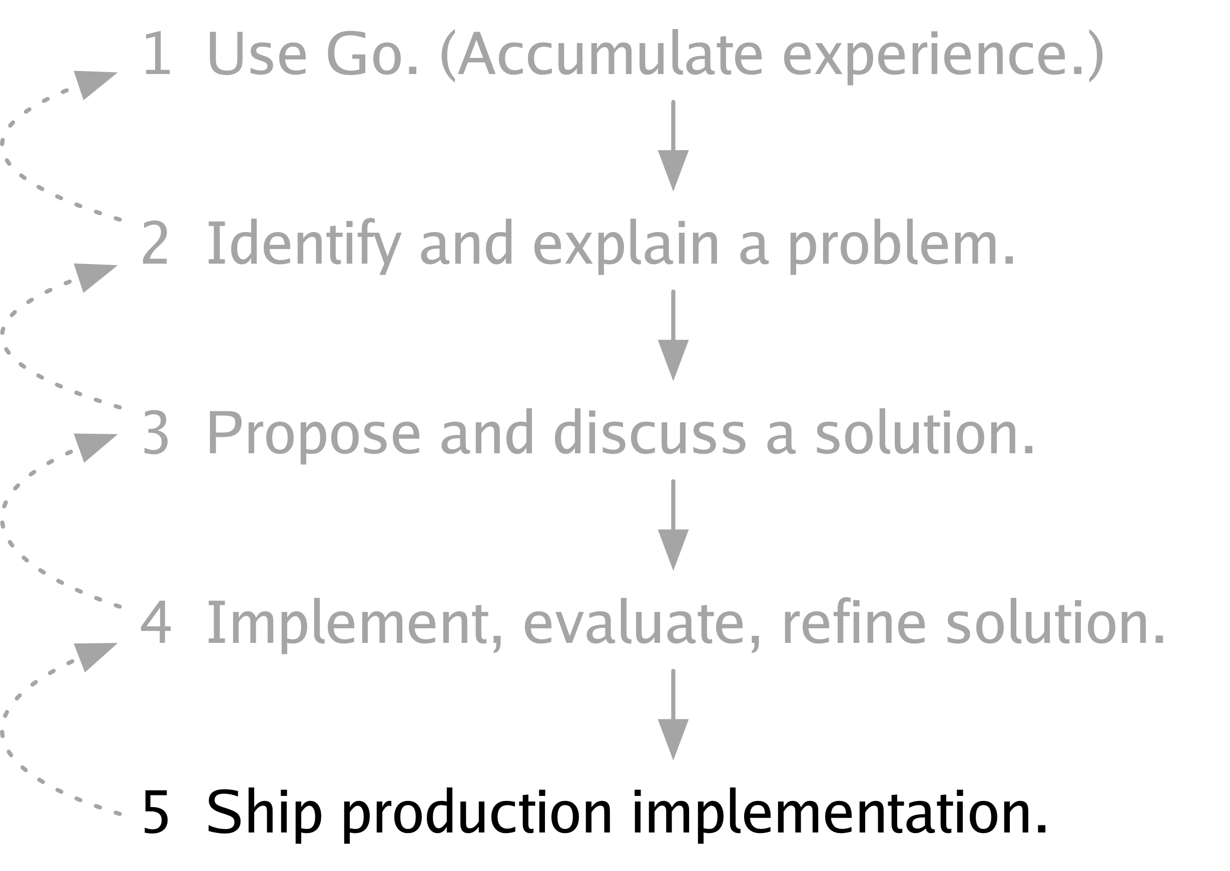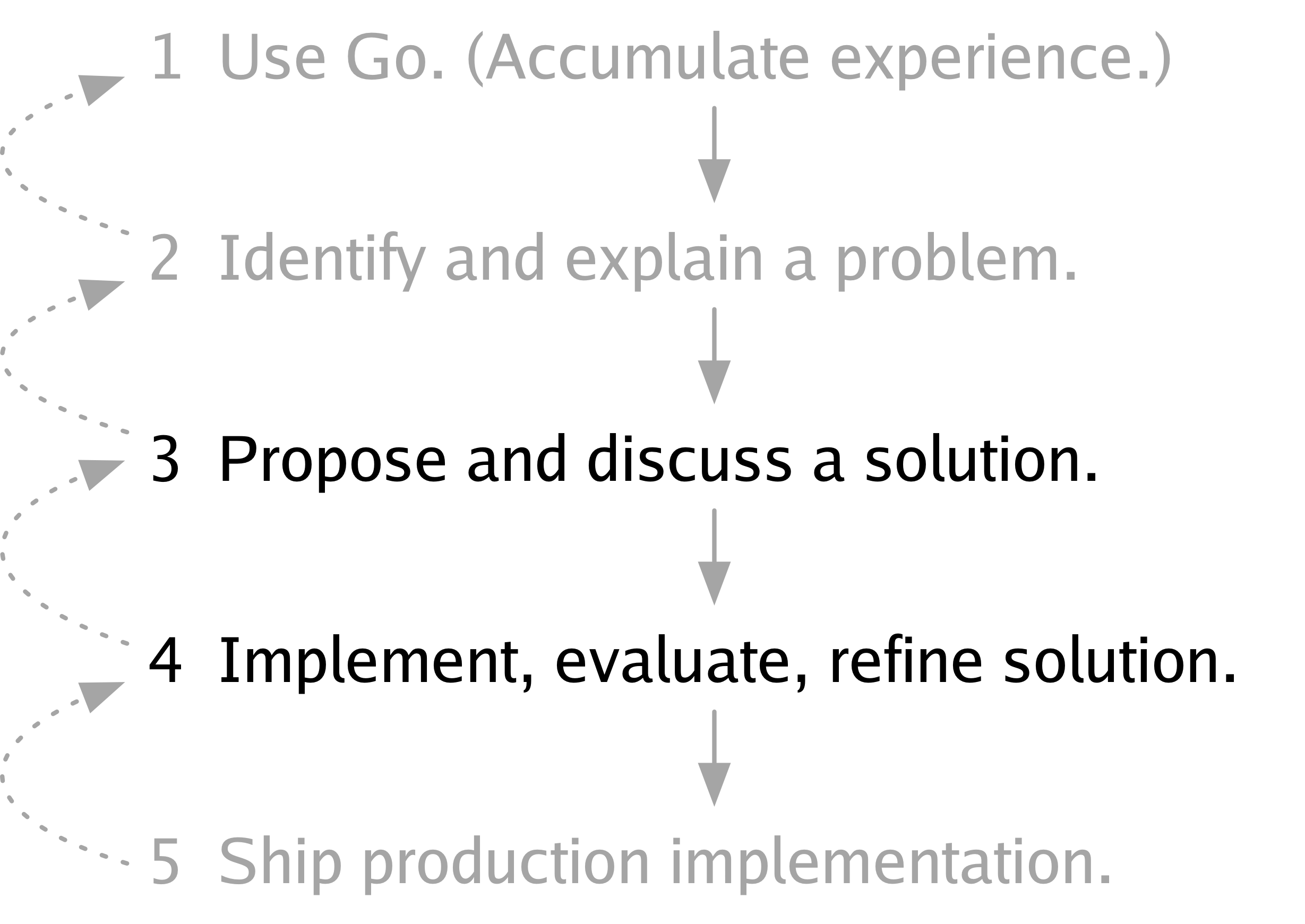 雖然我認為我們從未將這個流程作為一個整體來談論過,但我們解釋過其中的一部分。2012 年,當我們釋出 Go 1 並說現在是時候使用 Go 而不是更改它時,我們是在解釋第一步。2015 年,當我們引入 Go 更改提案流程時,我們是在解釋第三、第四和第五步。但我們從未詳細解釋過第二步,所以我想現在來做這件事。