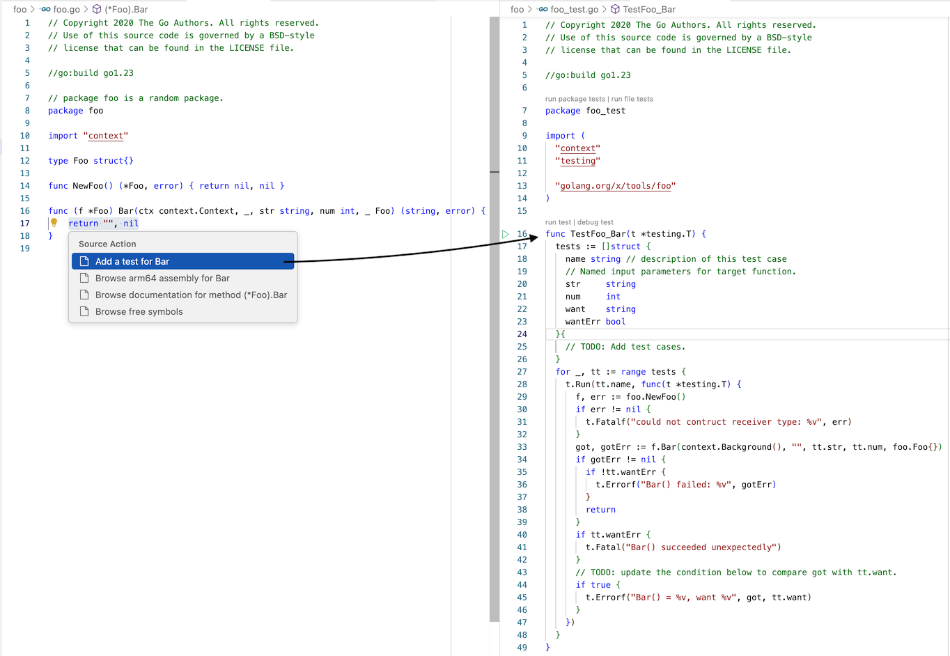 測試檔案:如果 _test.go 檔案不存在,gopls 會根據當前檔名(a.go -> a_test.go)建立它,並從原始檔案中複製任何版權和構建約束註釋。